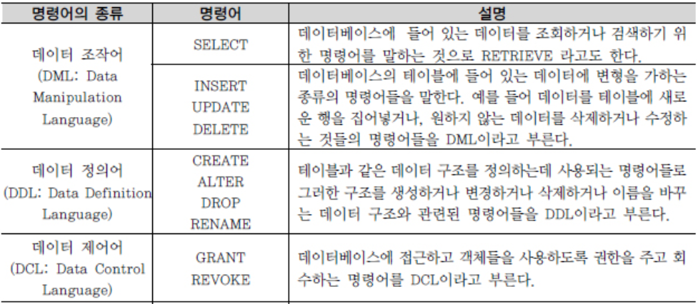 SQL(Structured Query Language)은 데이터베이스에서 데이터 정의, 데이터 조작, 데이터 제어를 하기 위해 사용하는 언어이다. 정의만 읽어 보면 처음 보는 분들은 와닿지 않을 것이다. 영어를 그대로 해석하면 구조화된 질문 언어로 이미 정해진 질문을 하는 언어로 우리는 정해진 질문으로 데이터베이스를 매우 쉽게 다룰 수 있다! 다음으로 "데이터의 정의, 조작, 제어를 위해 사용된다"는 내용은 말그대로 데이터 테이블을 를 만들거나 수정해서 데이터의 공간를 정의하고 데이터를 데이터 테이블에 값을 넣어주거나 값을 변경하거나 데이터 내용들을 꺼내 보는 데이터 조작이 있다 마지막으로 데이터 제어는 데이터 베이스의 접근 권한을 주거나 뺏거나 할 수 있다. 정리해놓은 표를 참고하시면 보기 편합니다.