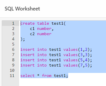 SQL Worksheet 창에 복사한 내용을 붙여넣기 했으면 이제 해당 내용을 실행하고 결과를 확인해 봅시다!!