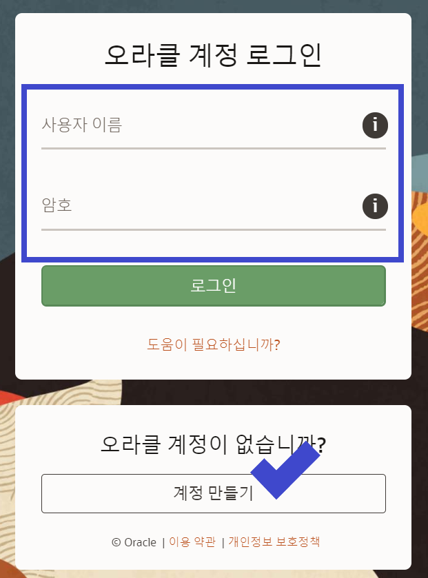 오라클 계정이 없다면 계정 만들기를 이용해서 오라클 계정을 만들고 계정이 있다면 로그인을 해주시면됩니다. 오라클 계정을 생성하면 나중에 LiveSQL이 아닌 직접 오라클을 설치할 수 있습니다.
