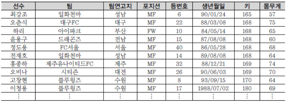 데이터 베이스는 테이블들의 관계로 이루어져 있고 테이블이 없으면 우리는 원하는 정보를 꺼내 올 수 없다. 테이블은 어느 특정한 주제와 목적으로 만들어지는 일종의 집합이다. 예를 들어 아래의 그림 처럼 K-리그 선수들의 정보들을 하나의 표에서 정리할 수 있다면, 이 표만 있다면 내가 좋아하는 선수들의 상세한 정보들을 볼 수 있고, 선수들의 정보를 상호간에 비교해 볼 수도 있다. 새로운 선수를 입력하려고 할 때 새로운 테이블을 생성할 필요 없이 데이터만 추가함으로서 선수들의 정보를 모두 관리할 수 있다. 또한 아래의 그림을 보면 선수, 팀, 팀연고지, 포지션, 등번호, 생년월일, 키, 몸무게가 각각의 칼럼(속성)이 되며, 해당 테이블은 반드시 하나 이상의 칼럼(속성)을 가져야 한다. 예를 들어 이청용 선수에 대한 정보는 아래와 같이 8개의 칼럼(속성)을 가지는 하나의 행으로 데이터화 되어 테이블에 저장된 것이다